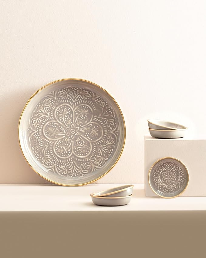 Setin içeriği beş adet tabak bir adet tepsiden oluşuyor. Her bir parça, iç dekorasyonunuzu tamamlayacak ince işçilik detaylarına sahiptir. Tabaklar, şıklıkla işlevselliği bir arada sunarken geniş iç hacimleriyle yemeklerinizi rahatça sunabilir misafirlerinizi etkileyebilirsiniz. Paslanmaz çelik malzeme, temizliği kolaylaştırır aynı zamanda uzun ömürlü kullanım sağlar.