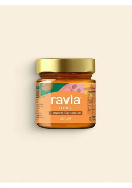 Ravla Flumix baharatlı bal karışımı aromatik üründür. Ihlamur balı ve geleneksel baharatların birleşimi sayesinde lezzetli farklı tat deneyimi sunar. %100 doğaldır katkı veya koruyucu madde içermez.