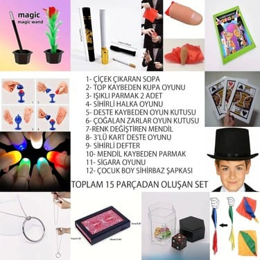 Toplam 15 parçadan oluşan set, doğum günleri, yılbaşı partileri veya özel kutlamalar için ideal hediye seçeneğidir. Çocuk boy şapkasıyla tamamlanan set, küçük sihirbazlara gerçek sahne deneyimi yaşatır. Eğlenceli hatta öğretici yönüyle öne çıkarken hayal gücünü destekleyen unutulmaz anlar yaşatan oyun deneyimi sunar.